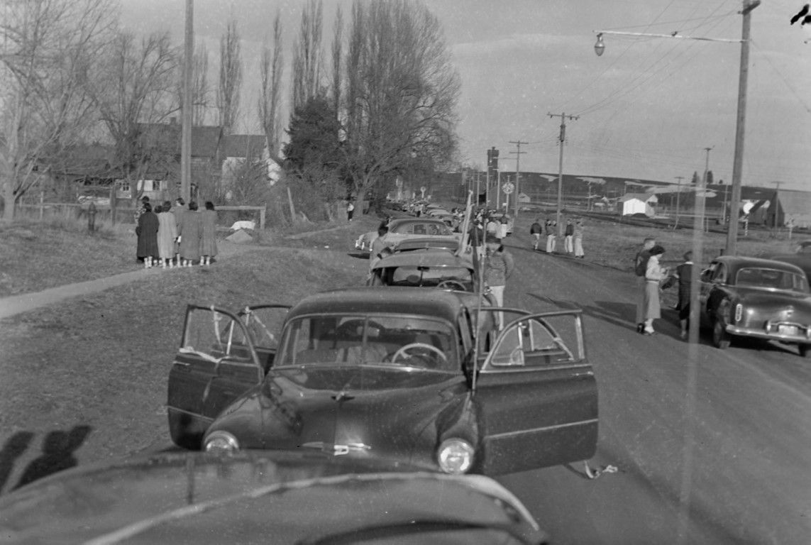 A line of parked cars and groups of people gathered on the street and sidewalk.