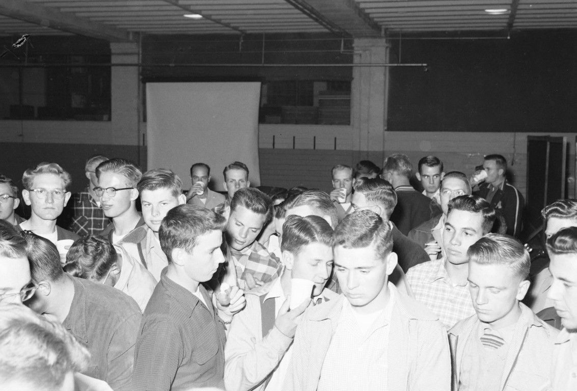 A large crowd of young men are gathered for a social event.