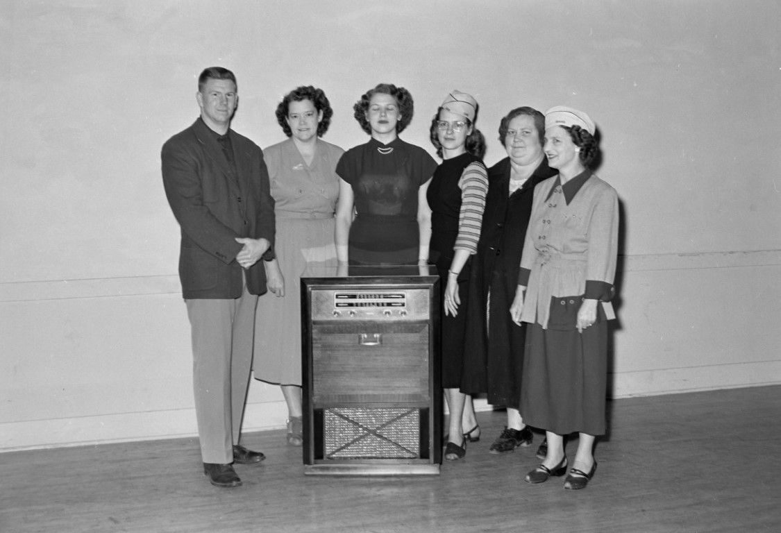 A man and five women standing behind a radio