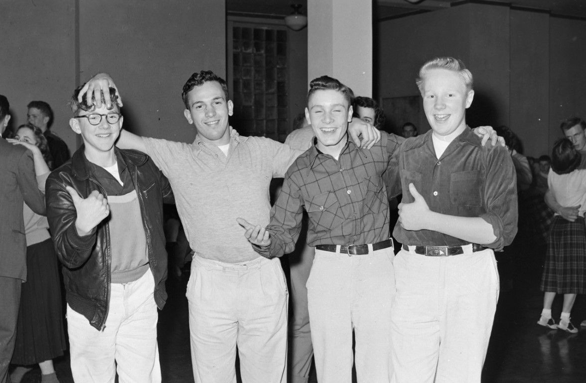 Four smiling young men are clowning around and having a picture made while couples can be seen dancing in the background.
