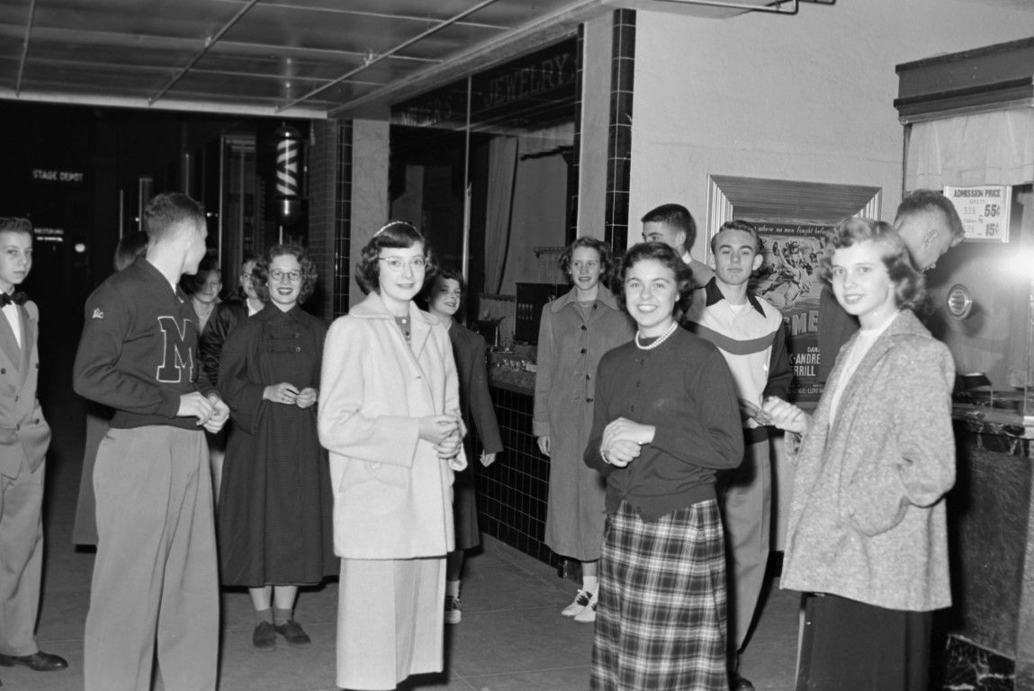 A group of young people is gathered outside the ticket window of a movie theater.