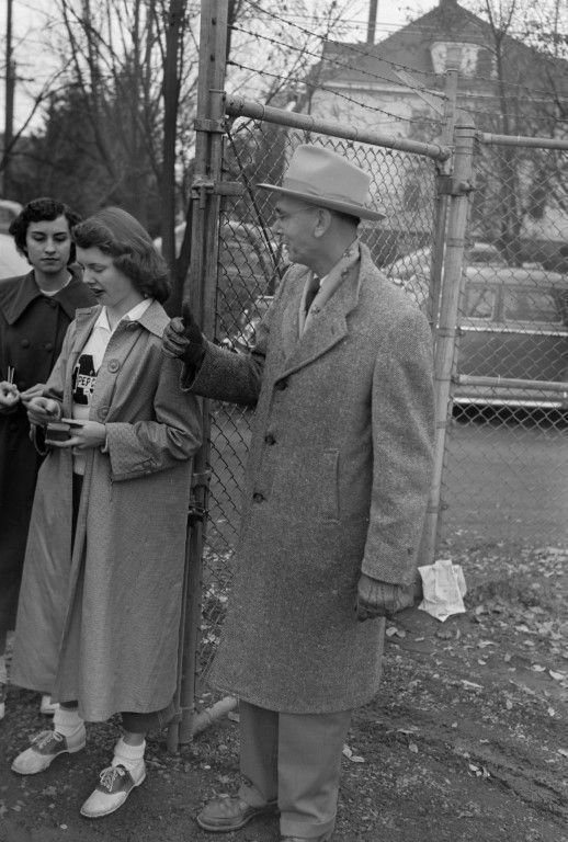 A man and two women standing inside an open gate next to the street with cars in the background.