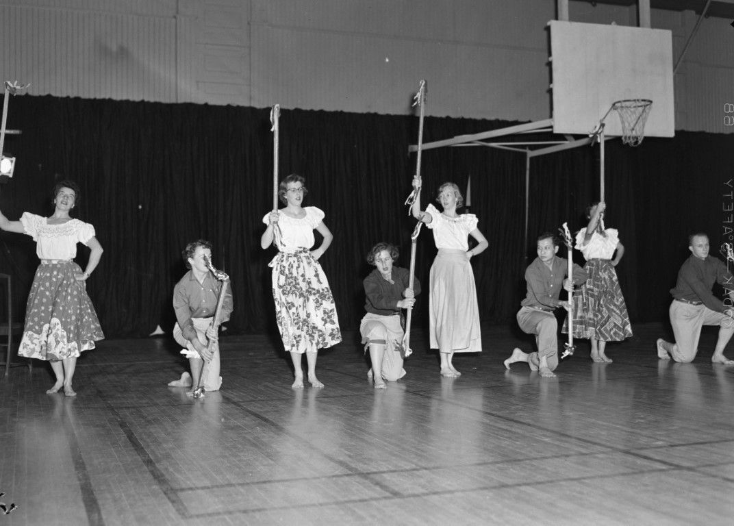 Young men and women in a line in a gymnasium holding poles with an emblem attached at the top.