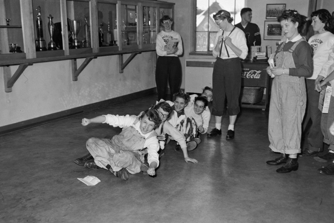 Members of the Moscow High School Pep Club clowning around pretending they are riding in a 5-man bobsled or on a toboggan.