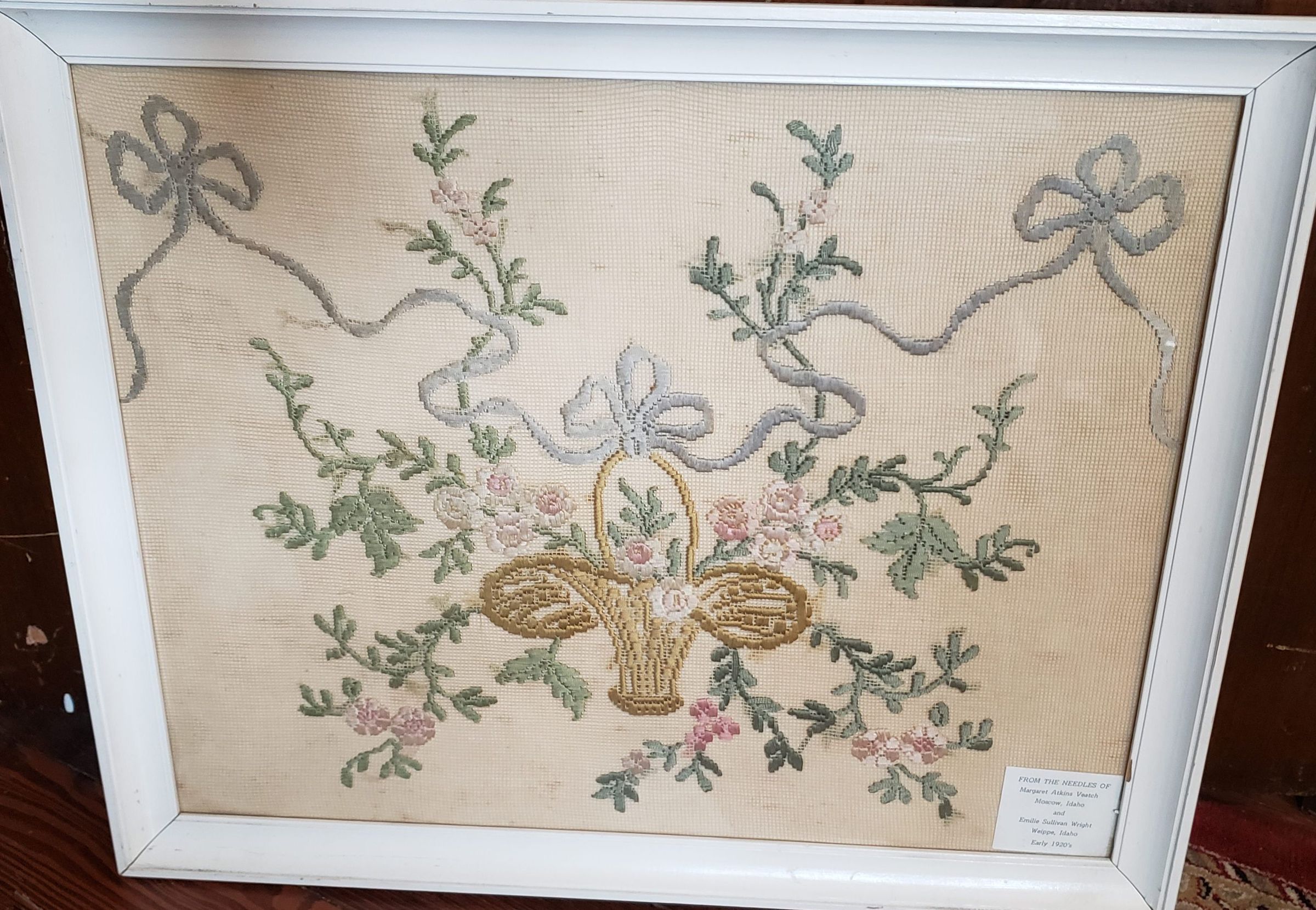 Framed needlework picture, Basket of flowers with ribbon bows "From the Needles of Margaret Atkins Veatch and Elilie Sullivan Wright Weippe, Idaho Early 1920s"