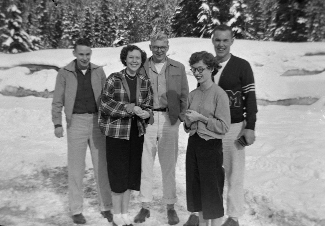 A group of five high school students, three young men and two women, standing outside in the snow with trees in the background