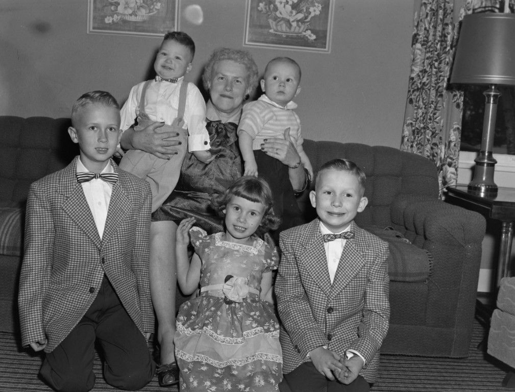 Five kids getting a picture taken with grandma at Christmas. Three are kneeling in front of the couch and two are being held by grandma.