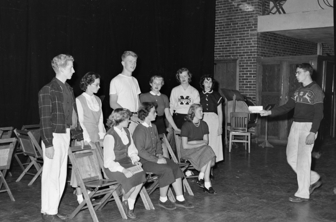 Young actors and actresses rehearsing while seated or standing on the stage.