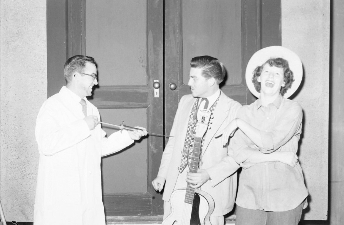 A man dressed as a doctor and holding an over-sized hypodermic is pretending to inject an Elvis impersonator who is standing next to a woman wearing a floppy hat.
