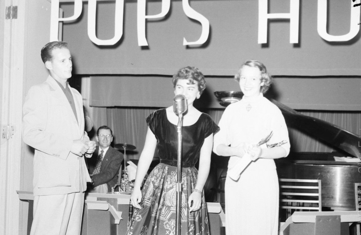 A man and two women are standing on a stage in front of a piano and drum kit.