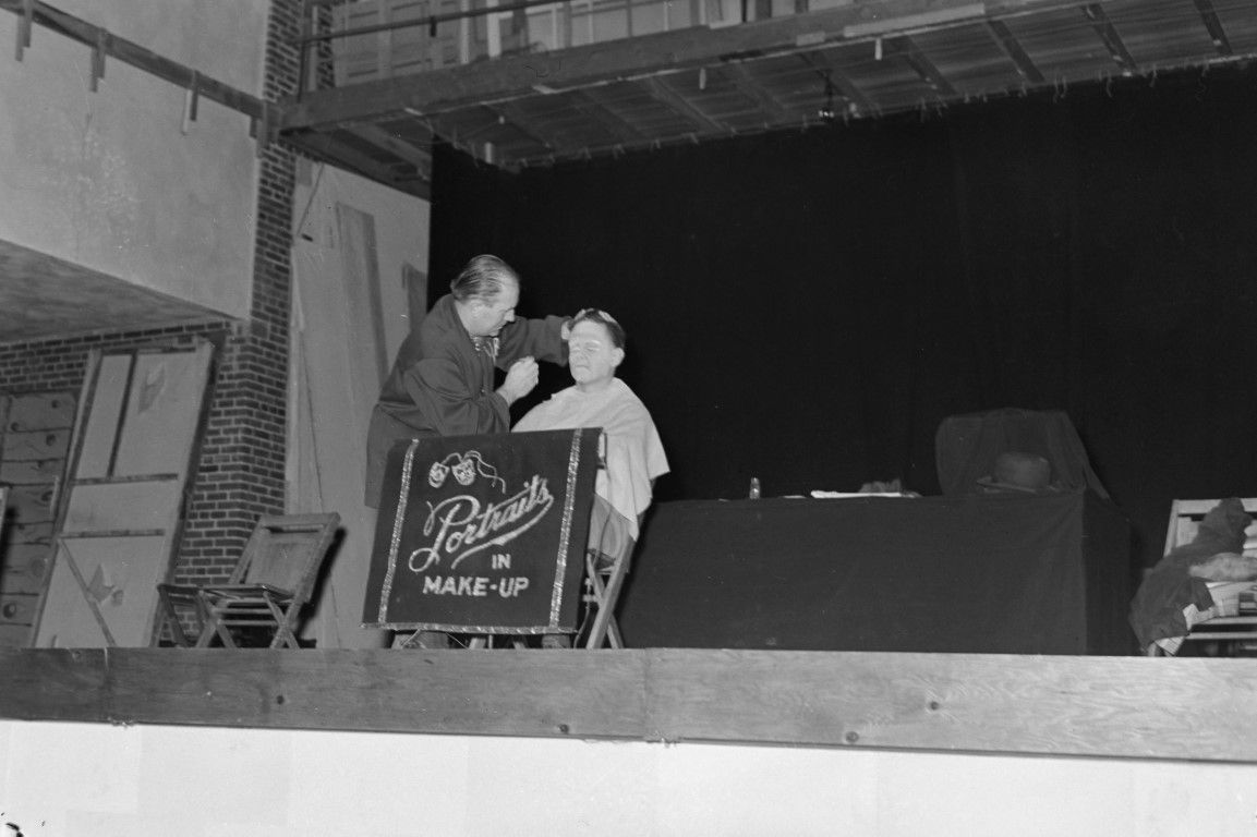 A man in a smock is applying makeup to another man seated on a stage.
