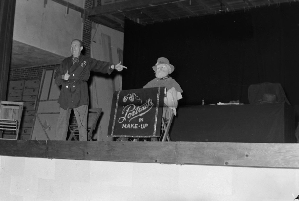 A man in a smock is standing on stage and pointing at another person in makeup who is sitting behind a sign that says "Portraits in Make-up."