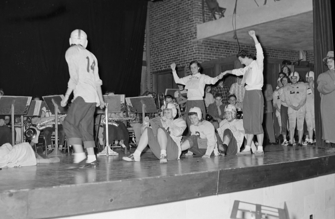 Young actors in football uniforms and musicians rehearsing on stage.