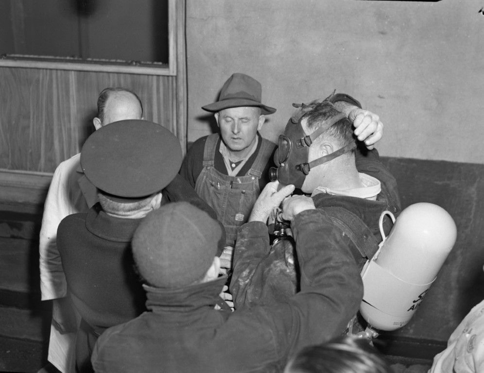 A fireman wearing an air supply tank is donning a facemask with the assistance of several other men.