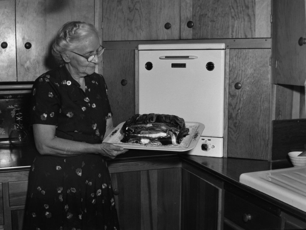 A woman holding a cake in the kitchen. Behind her are counters and what is believed to be an oven.
