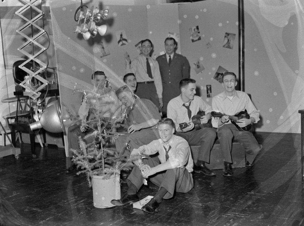 A group from the Air Force ROTC gathered around a "Charlie Brown" Christmas tree. One man is playing a ukulele and another man is playing a mandolin.