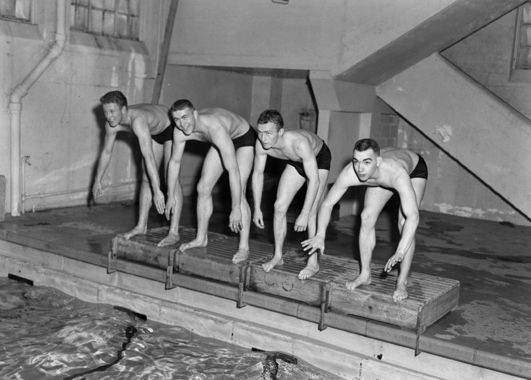Four University of Idaho swim team members about to jump into a pool and race.