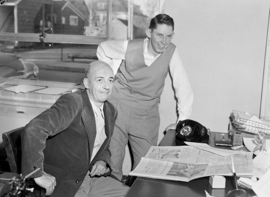 Two men at a desk are reading a newspaper.
