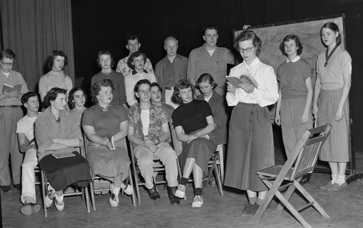 A group of students are gathered around and listening to a woman reading lines from a play.