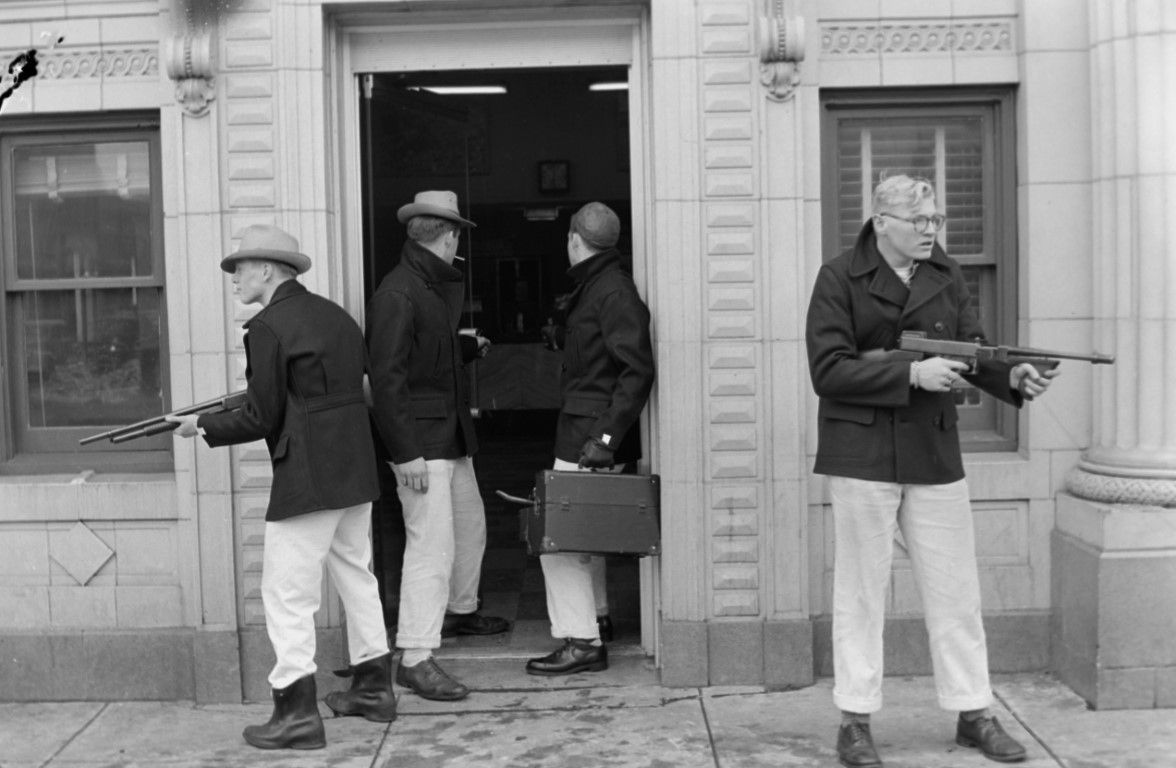 Four men with guns are on the sidewalk leaving the bank after a staged robbery.