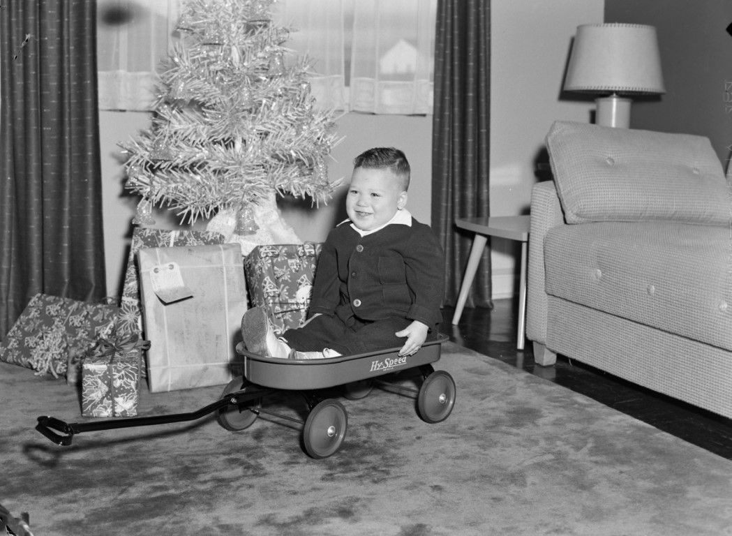 A toddler sitting in a little wagon in front of a Christmas tree with presents around it.