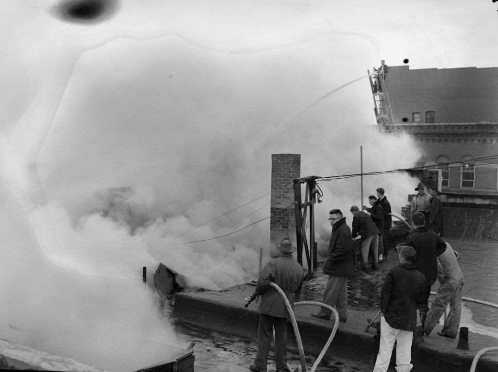 A group of men with hoses extinguishing a fire on a rooftop amidst billowing smoke.