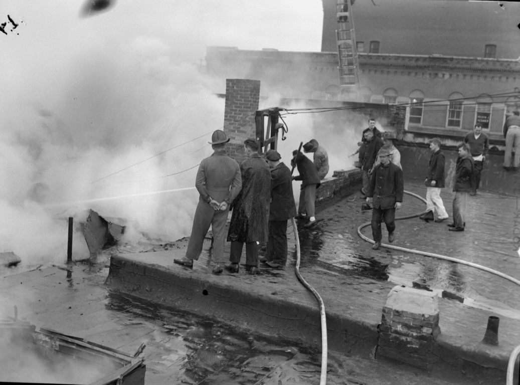 A group of men with hoses extinguishing a fire on a rooftop amidst billowing smoke. The extended ladder from the aerial truck can be seen in the background.