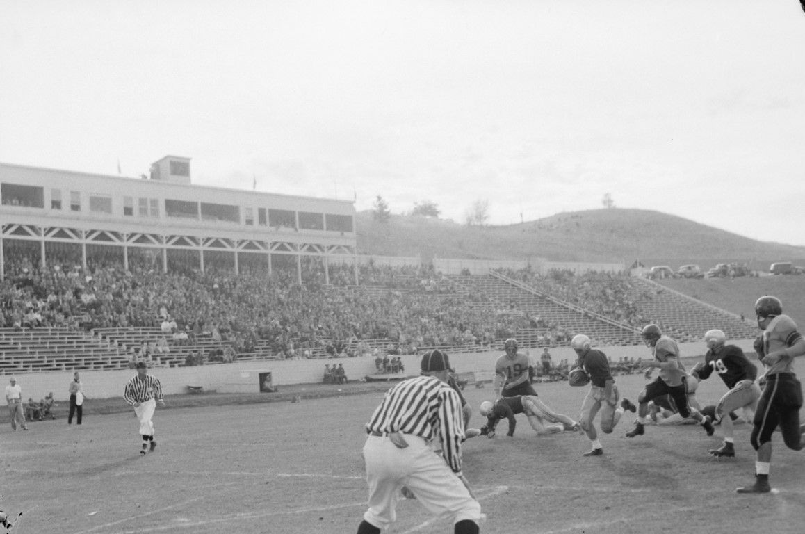 A football player is running with the ball and is about to score a touchdown. Neal Stadium U of I
