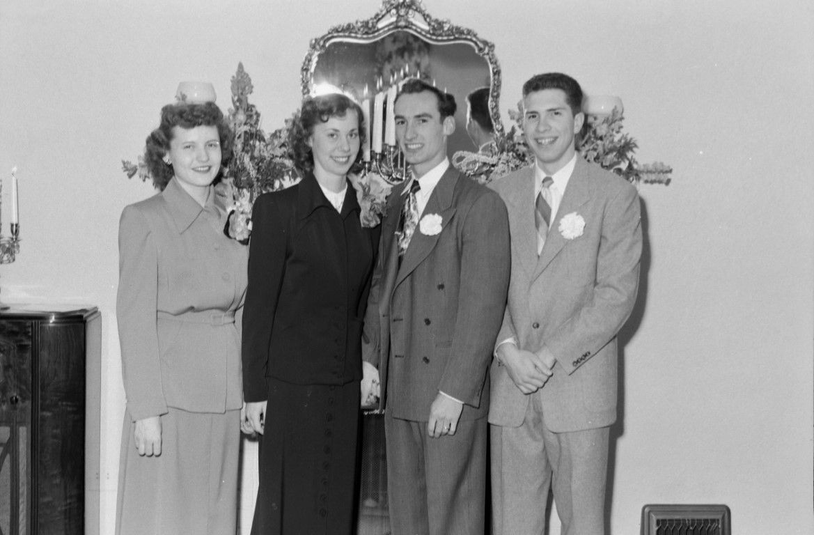 Two women in dresses and corsages and two men in suits and boutonnieres posed for photo in front of a fireplace with a mirror, flowers, and candles on the mantel