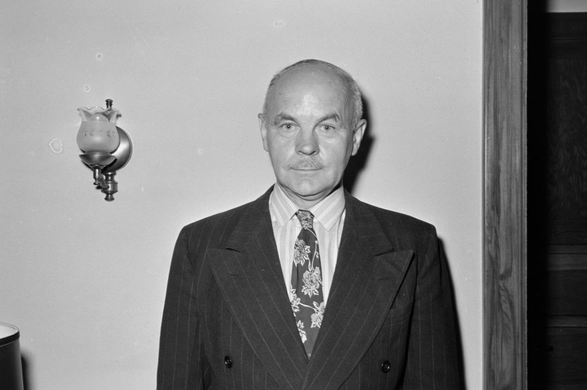 A head and shoulders shot of a man in a pin-stripe suit standing against a wall between a lamp and a doorway. Similar to 1157.