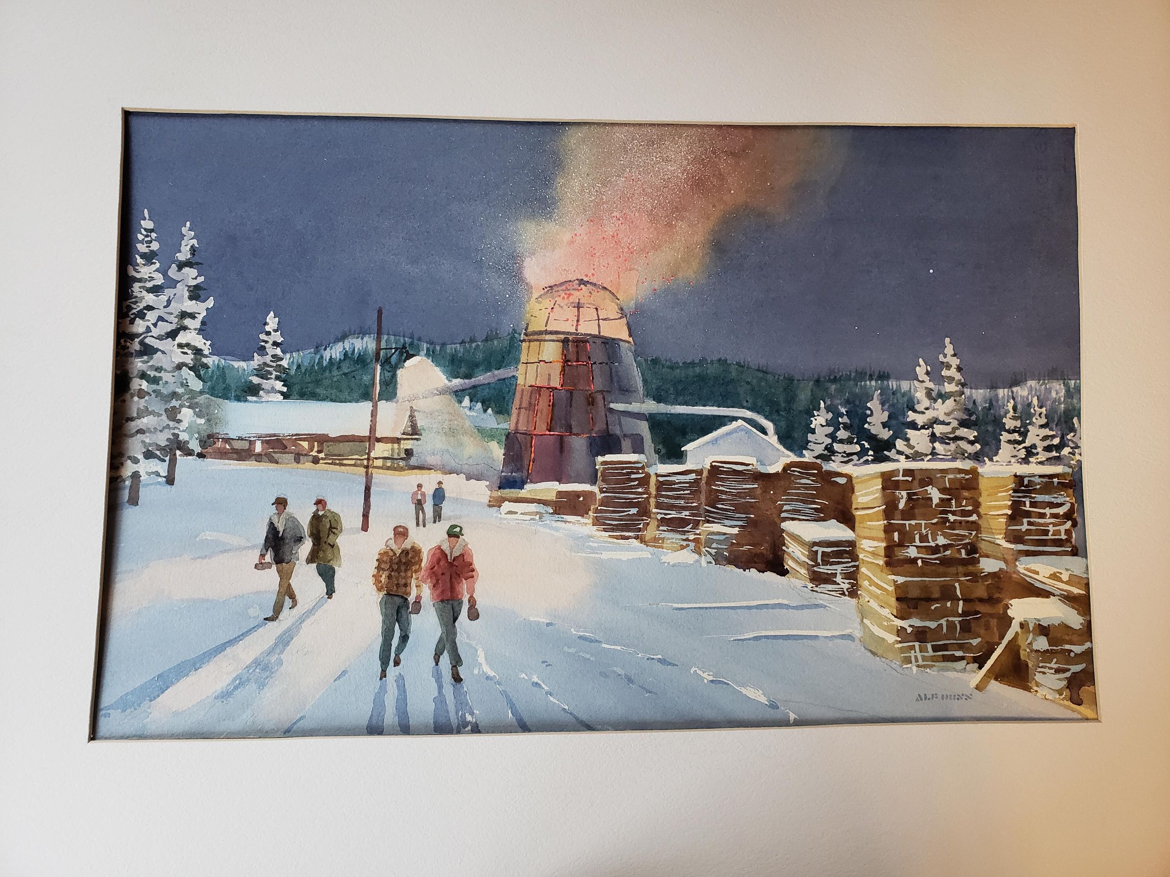 Alf Dunn original watercolor painting showing six people walking away from a burning silo in the snow. This is one of the original paintings used to create the LCHS Alf Dunn greeting cards.