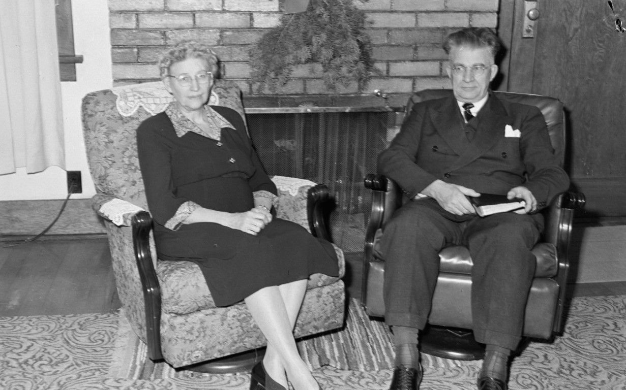 A well-dressed gray haired couple is sitting in swivel rocker chairs in front of a fireplace. The man is holding a book that appears to be a Bible.