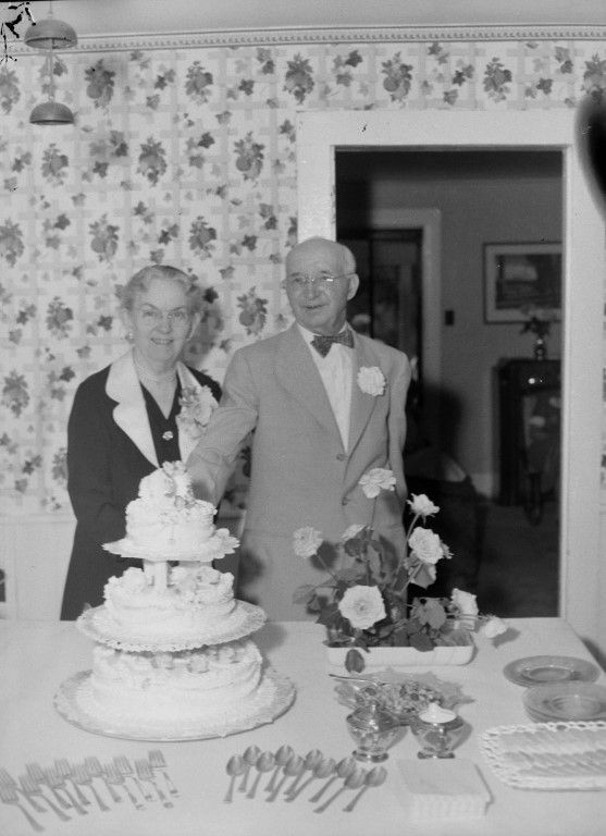 A well dressed gray-haired couple are standing at a table which has a 3-layered decorated cake, flowers and plates on it. Both people have flowers pinned to their lapels, and the man is wearing a bowtie.