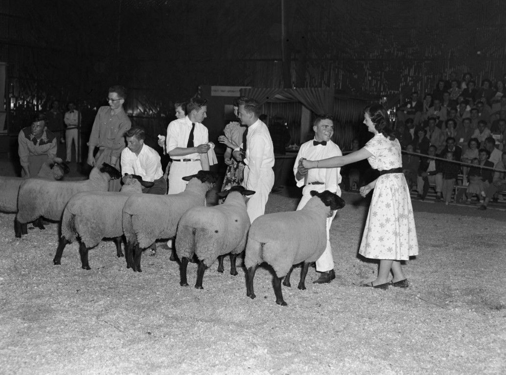 Two women are distributing ribbons to six young men and their sheep at an agricultural fair.
