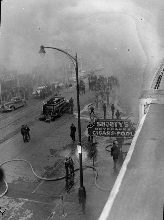 Firefighters battle a fire at Shorty's on Main Street where a crowd of onlookers has gathered. The firetruck and passenger cars are parked on the street.