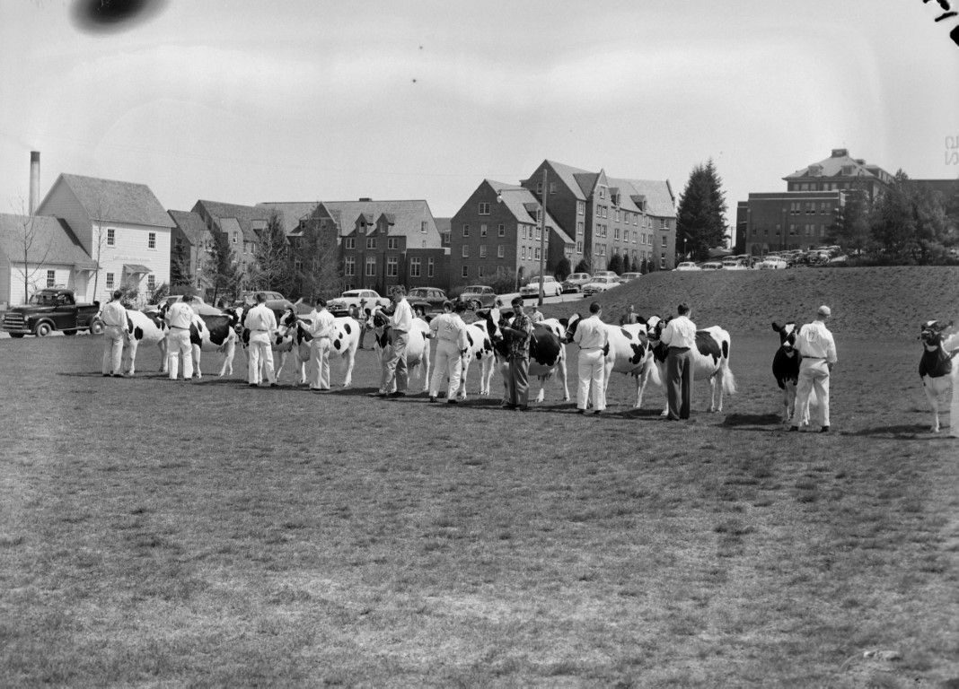 A group of men are showing their cows in a grassy area on the University of Idaho campus. Cars and campus buildings are seen in the background.