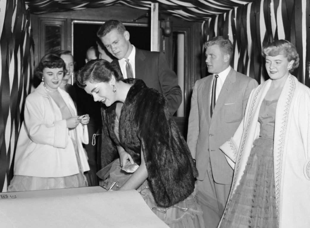 Couples in formalwear sign in to an event in a hallway covered in streamers.