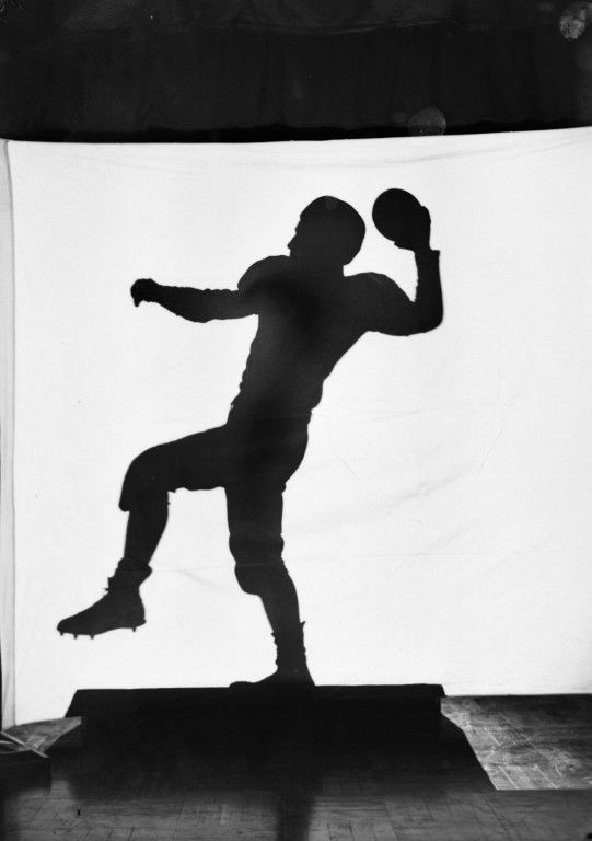 A silhouette of a uniformed football player about to throw a pass.