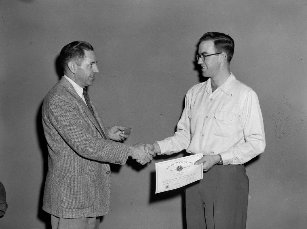 A young man is shaking hands with the presenter as he is being given "The 4-H Award of the Silver Clover."