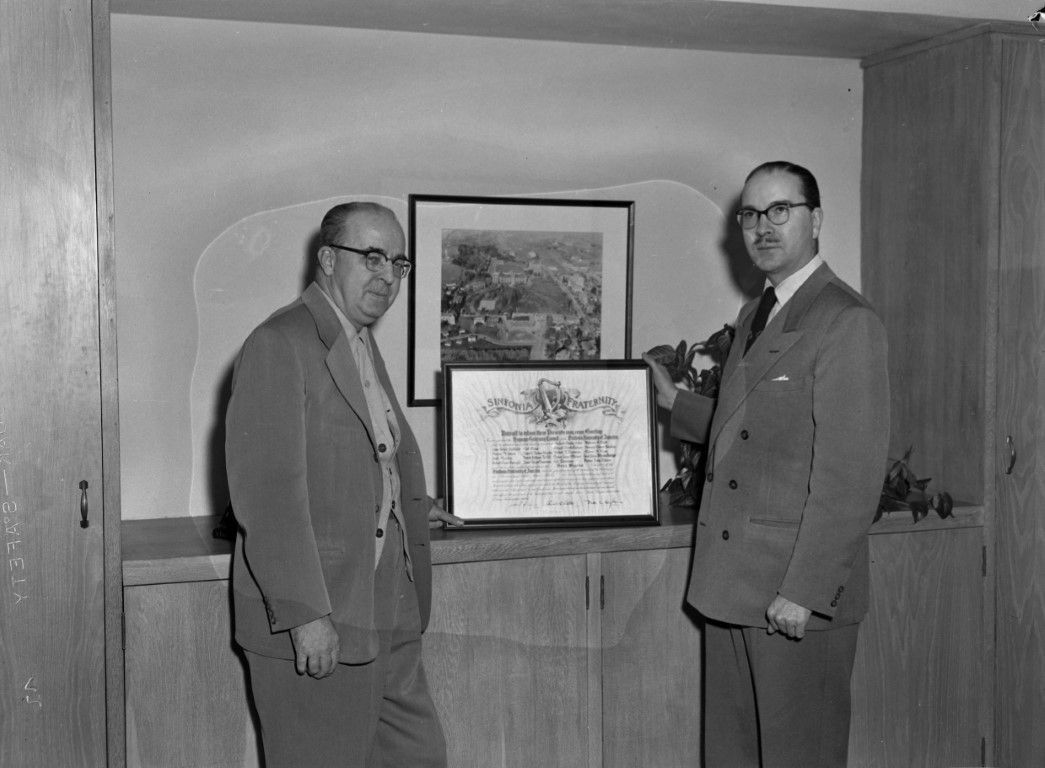 Two men in suits from the Music Department are holding a framed Sinfonia Fraternity document.