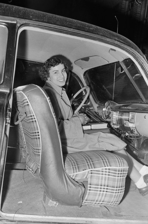 A smiling young woman sitting in a car with the door open and books on her lap.