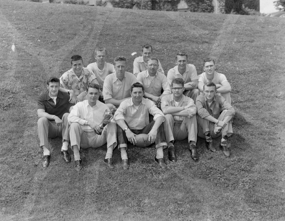 A group of men is sitting in the grass on a hill with a trophy and a football.