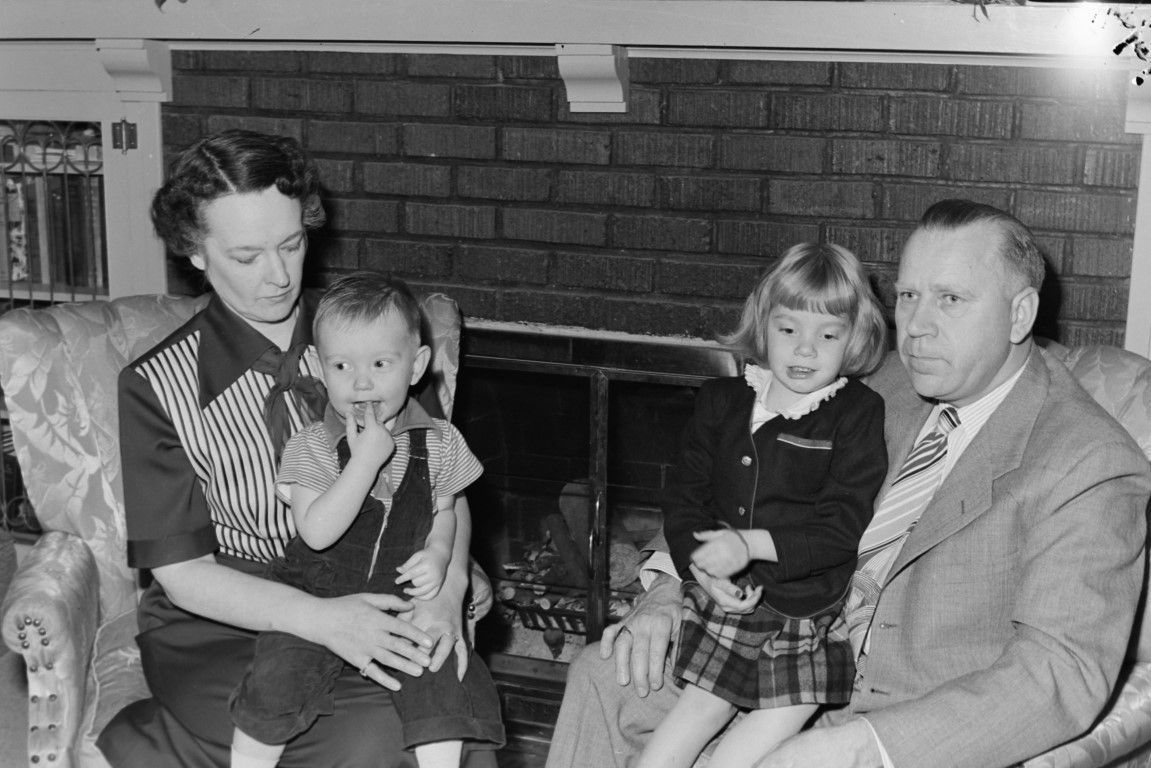 A woman holding a little boy and a man holding a little girl sit in chairs in front of a fireplace (same children as 1166-1168, 1170) Similar to 1172