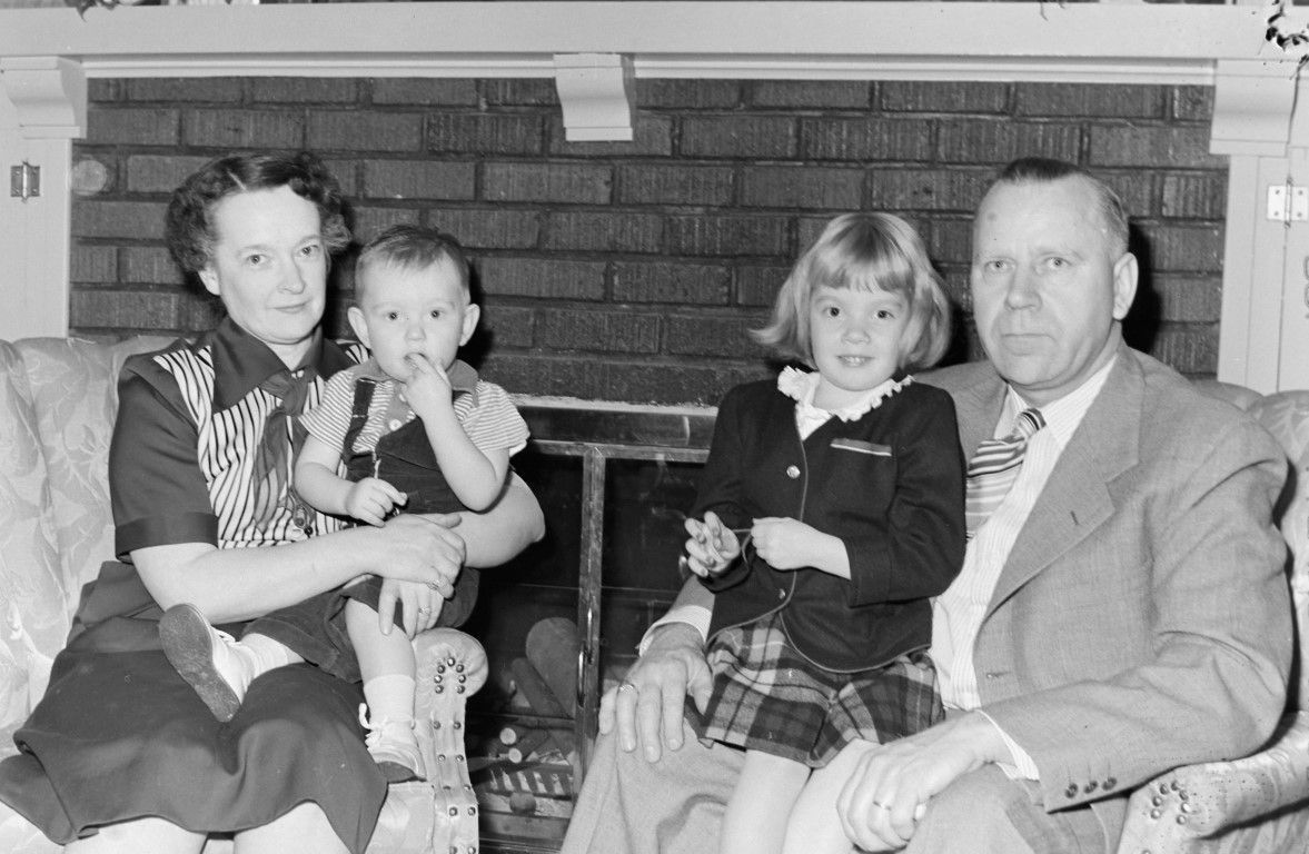 A woman holding a little boy and a man holding a little girl sit in chairs in front of a fireplace (same children as 1166-1168, 1170) Similar to 1173