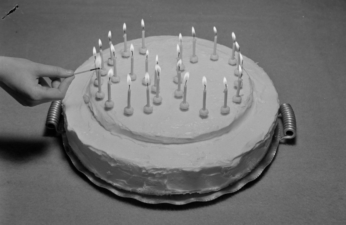 A hand is lighting the candles on a cake which are arranged as the number 60.