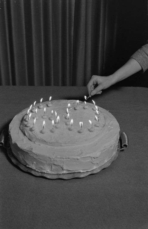 Birthday cake with an arm extended to light the candles configured as the number 60.