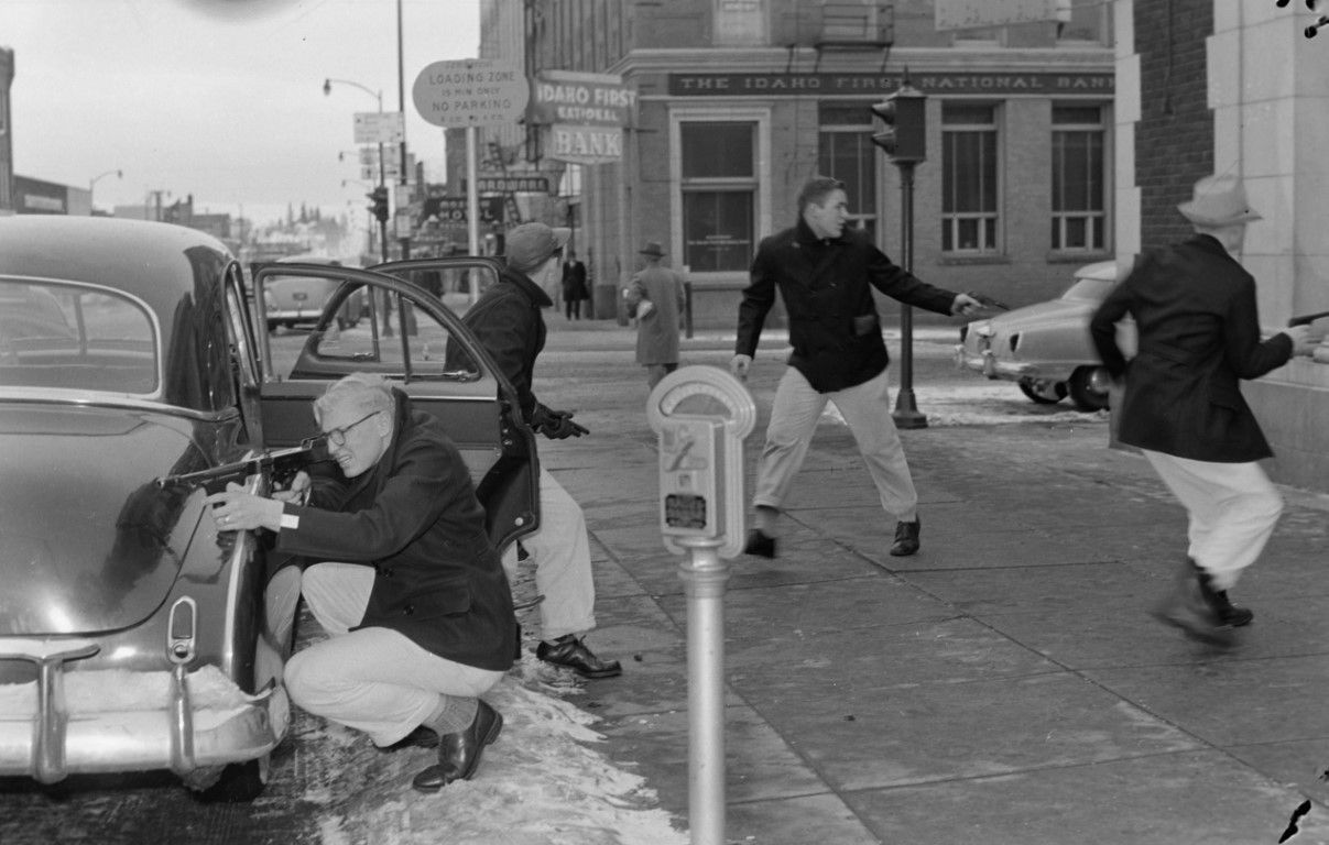 Four mock bank robbers staging a shootout near the Idaho First national Bank on Sixth Street and Main in Moscow.