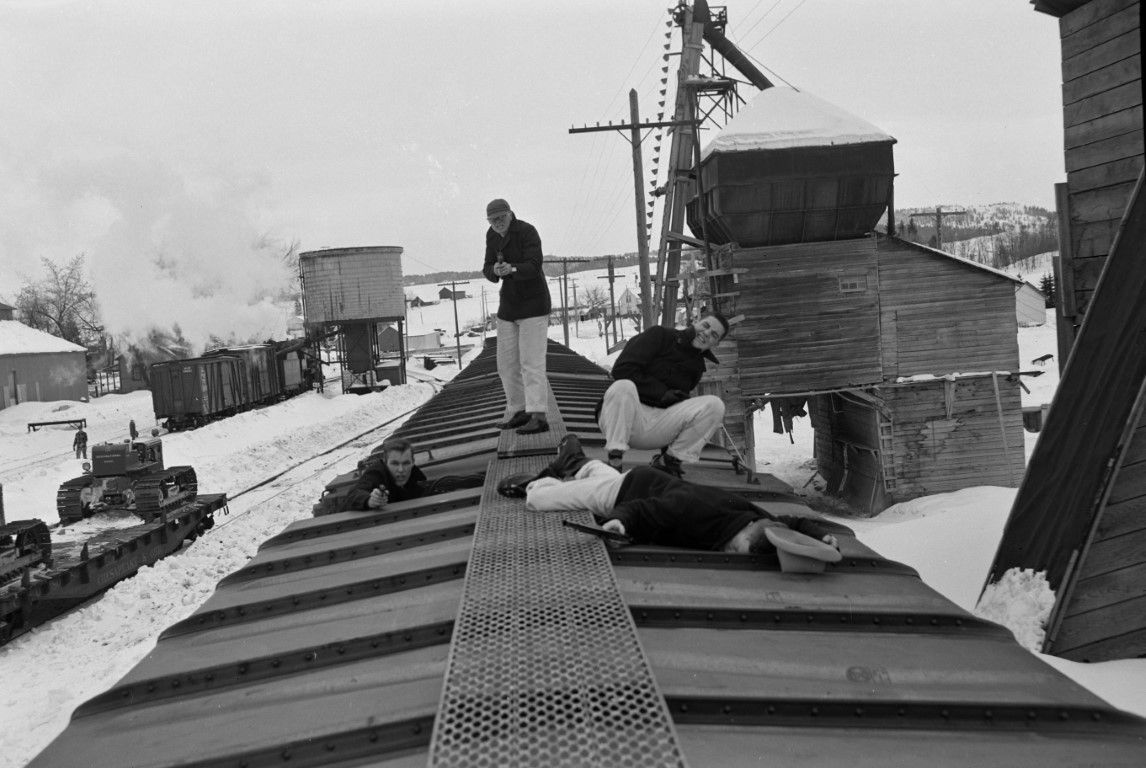 Four young men with guns are atop a train car staging a gunfight in the rail yard.
