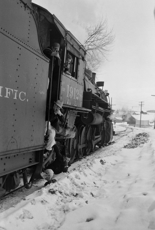 Four young men are staging a mock gunfight from the side of a locomotive.