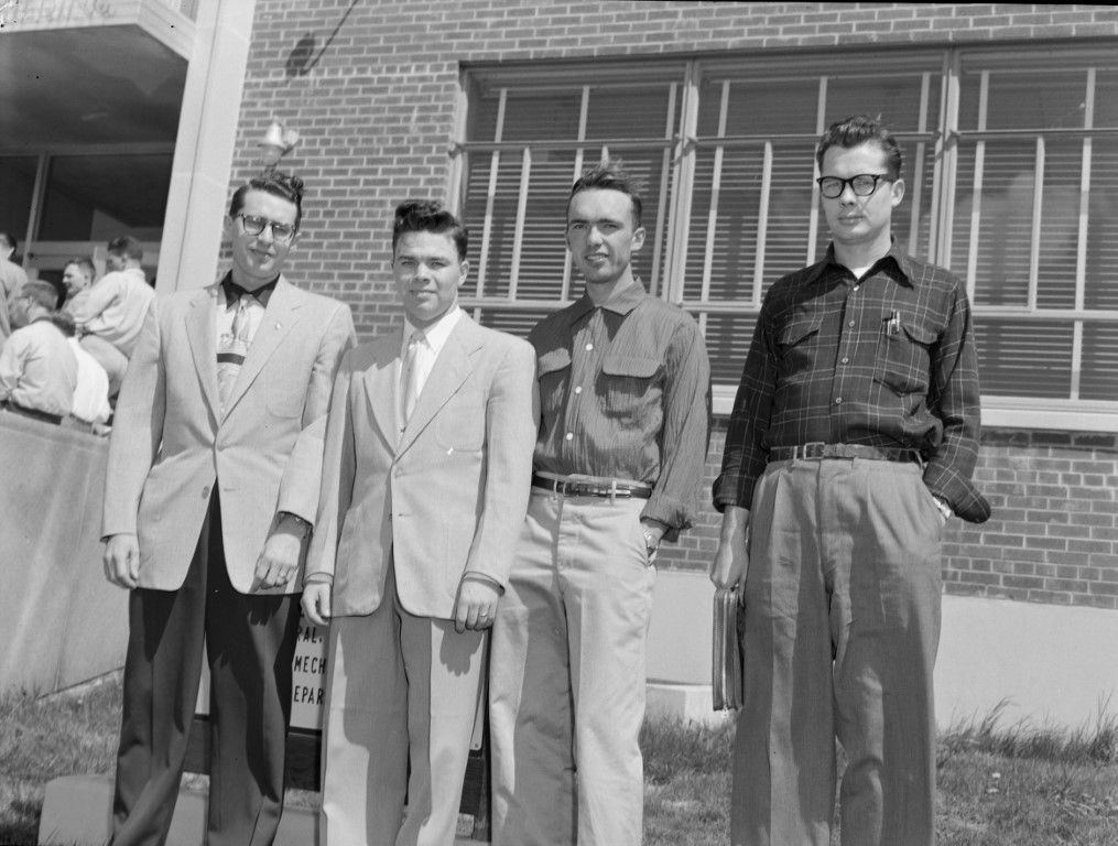 Four young men are standing in front of a brick building and others are seated on the steps in the background.